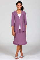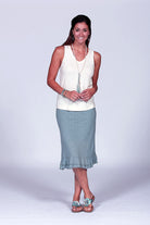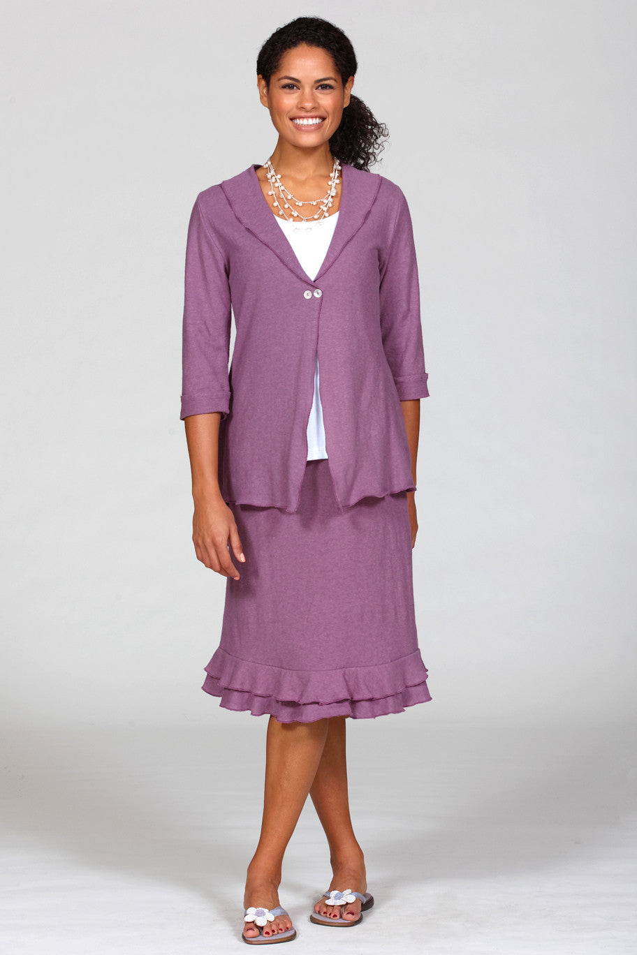 Comfy knee length knit skirt with a feminine double flounce at the hemline. Narrow elastic waist, with a slight A-line shape.