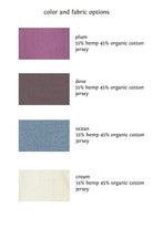 55% hemp 45% certified organic cotton jersey. Preshrunk, may be machine washed and dried.
